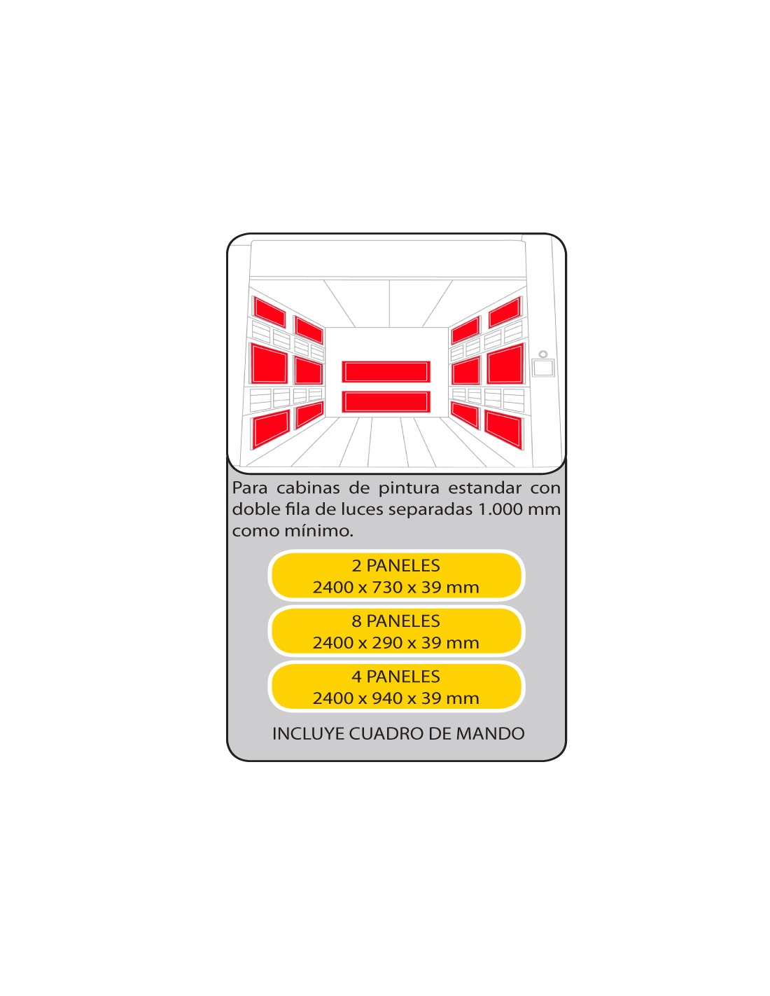 - SP600403: Para cabinas de pintura estandar con doble fila de luces separadas 1.000 mm como mínimo. 2 PANELES: 2400 x 730 x 39 mm. 8 PANELES: 2400 x 290 x 39 mm. 4 PANELES: 2400 x 940 x 39 mm. INCLUYE CUADRO DE MANDO.