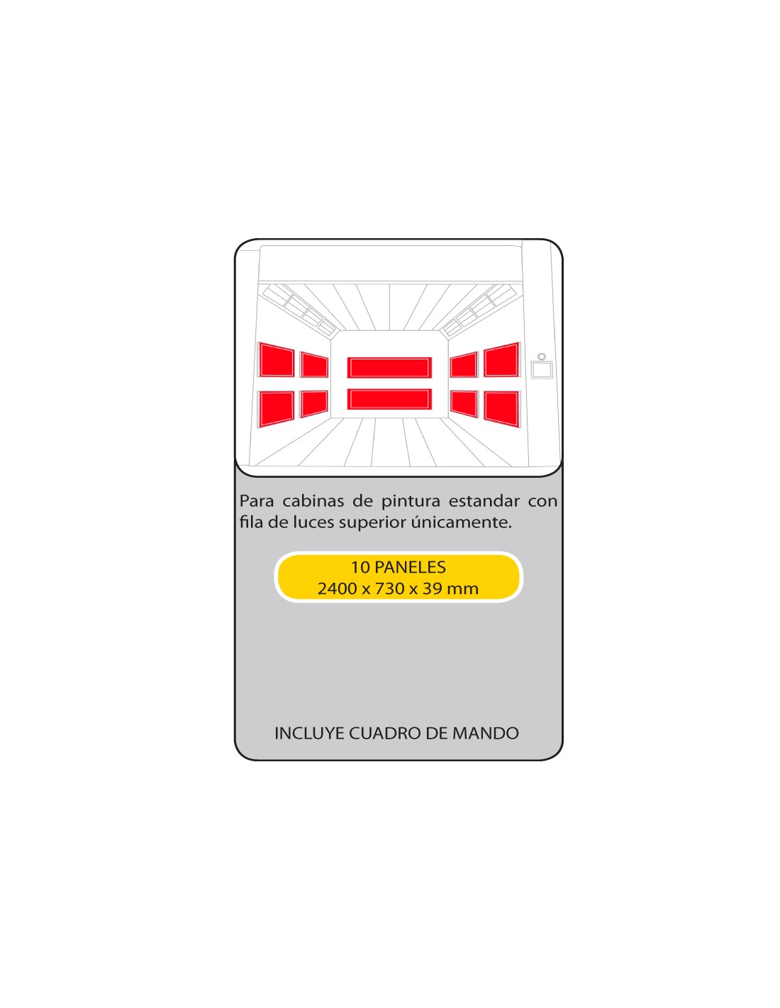 - SP600401: Para cabinas de pintura estándar con fila de luces superior únicamente. 10 PANELES: 2400 x 730 x 39 mm. INCLUYE CUADRO DE MANDO.